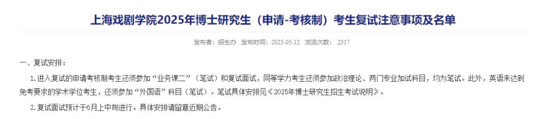 据上海戏剧学院招生办消息,进入复试的申请考核制考生还须参加“业务课二”(笔试)和复试面试,同等学力考生还须参加政治理论、两门专业加试科目,均为笔试。此外,英语未达到免考要求的学术学位考生,还须参加“外国语”科目(笔试)。复试面试预计于6月上中旬进行。