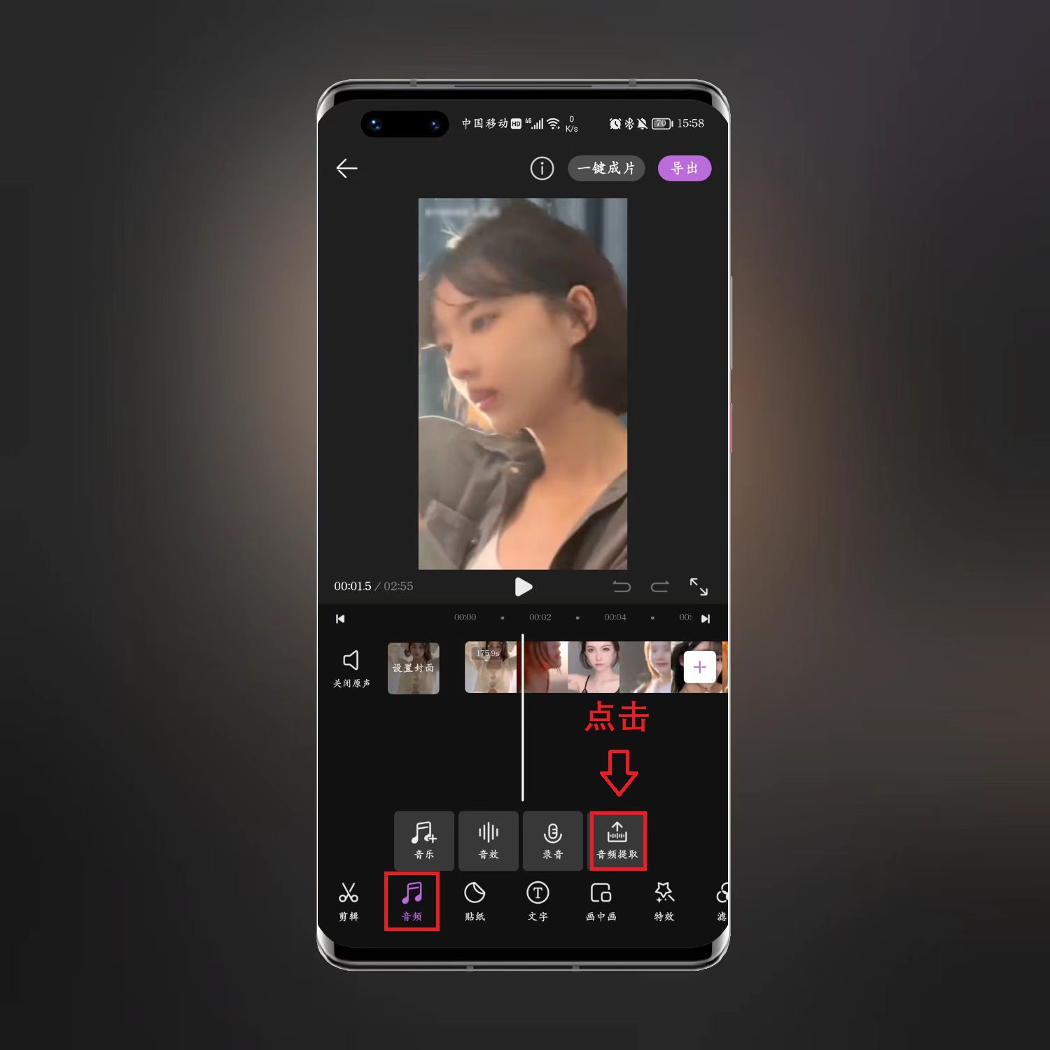 2.接着会自动跳转到,华为手机自带的花瓣剪辑工具里,我们点击底部的【音频】,选择【音频提取】功能。
