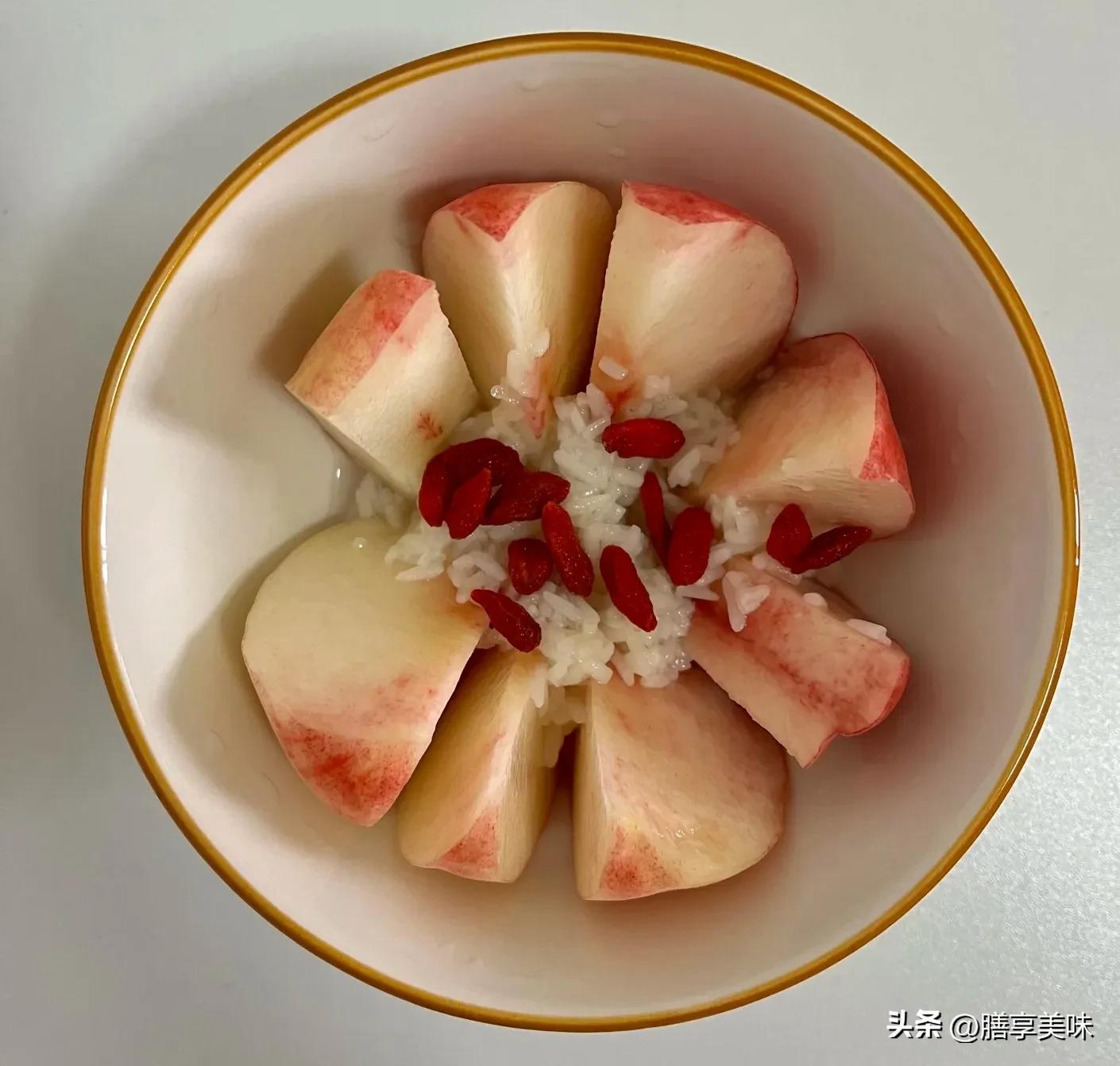 做法:桃子洗净切块,放碗里隔水蒸30分钟(碗里加入两茶匙水,和桃皮一起蒸,通气活血作用更好),最后再倒入米酒和枸杞蒸2分钟即可。