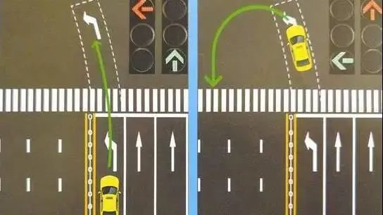 有待转区的红绿灯路口,需在直行绿灯时,进入待转区,等候左转绿色信号灯或绿色掉头指示灯掉头。另外要注意有两条左转车道时,应在最左侧车道掉头。