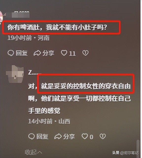 他们认为,这妥妥就是为了控制女性的穿衣自由,怎么没见男的光膀子在路上走的时候有人说,主持人胖了衣服紧身一点,就会被追着抨击。
