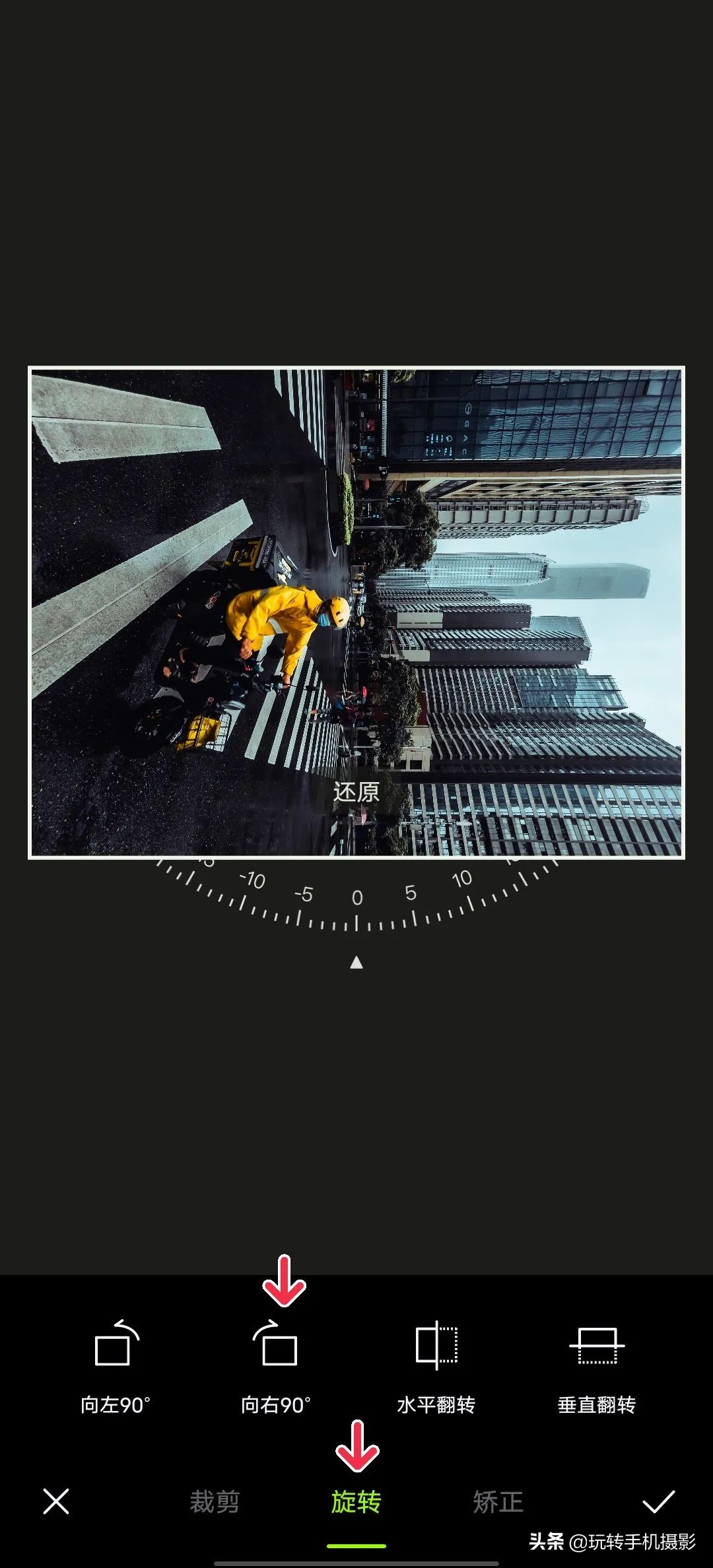 接着点击「合并图层」,再点击「调节」➟「构图」,把照片旋转回原来的样子,这样画面中的线条感就是垂直的了。