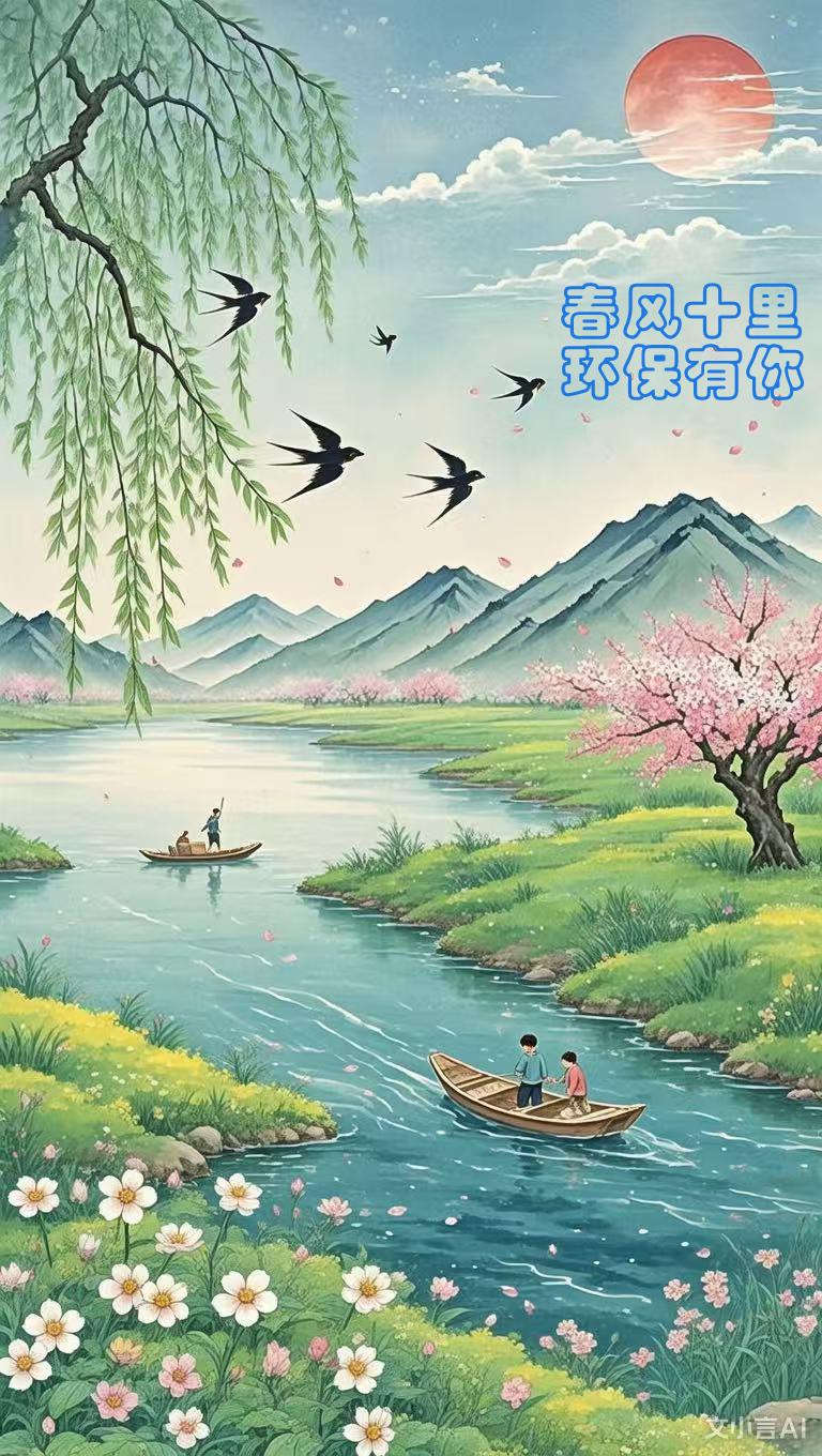 豆包评语:这张图片可以给到 7 分。画面呈现出春日山水美景,色彩柔和,意境优美, “春风十里 环保有你” 的文字与景色融合较好,传递出环保理念。但在环保元素的独特性和创新性展示上稍显不足,所以综合给 7 分。