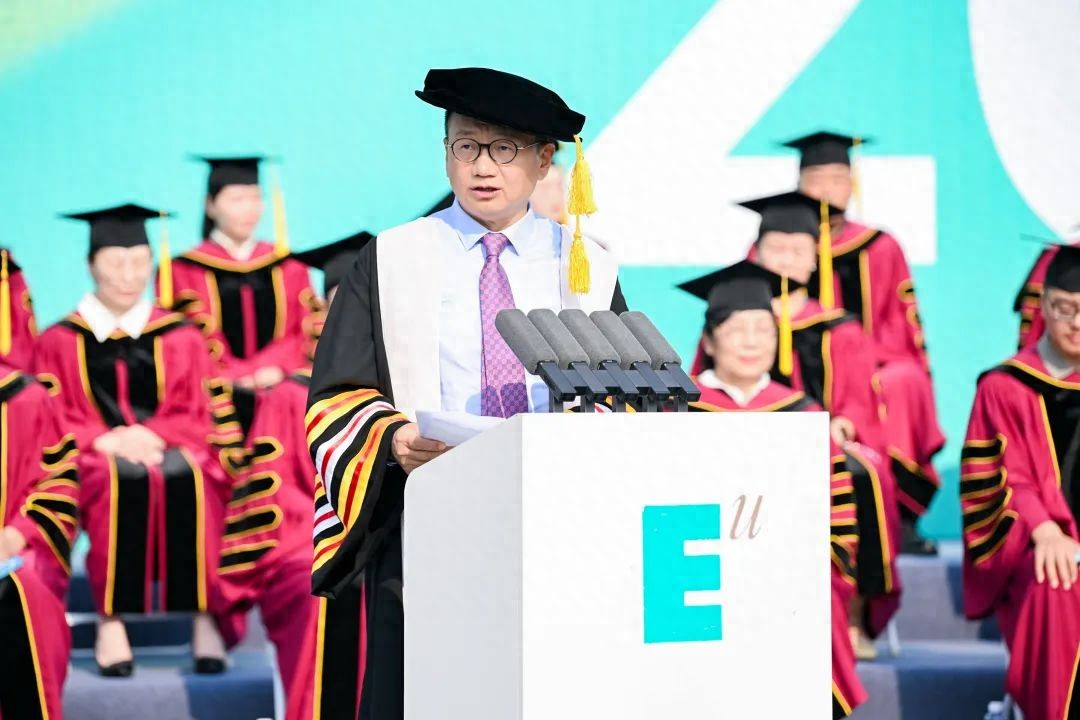我知道,此刻你们心中必然百感交集:一边是终于“出笼”的兴奋和对未来的憧憬,一边是对同学、室友、社团好友的不舍。还记得当初,我们坚持让不同专业的同学住在一起,要求每个人都加入社团吗?这安排可能添了点“麻烦”,但它最大的好处,就是帮你们打破了专业的“小圈子”,大大拓宽了交友面,让你们从“书斋里的学生”,更快地成为懂得与人相处、懂得团队协作的“社会人”。很多年以后,你可能发现这样的社会交往收获丝毫不亚于你的学习经历。这就是你们喜欢欧亚、爱欧亚的原因:颜值高,有温度,很用心,没爹味。(掌声)