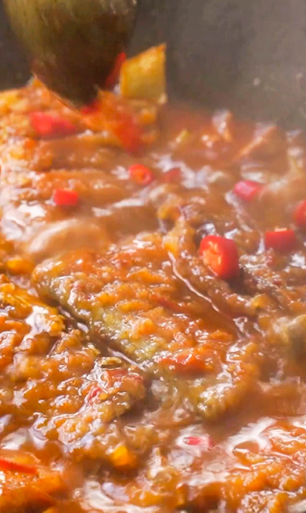接着加入酱、辣妹子或者豆瓣酱小火慢炒香,
