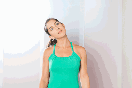 注意:扭头幅度不要太大,动作放慢一些,到中间位置时,可以将头部后仰,这样颈部周围的肌肉都能得到放松。