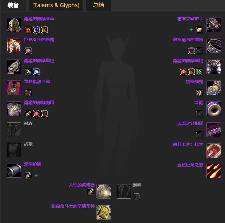 归乡纹章替代品:头部-T7套装,项链-愚者的试炼,手套-T7套装,戒指2-强力指环,饰品1-死亡之钟,饰品2-五色巨龙之怒,主手武器-恐怖之怒。