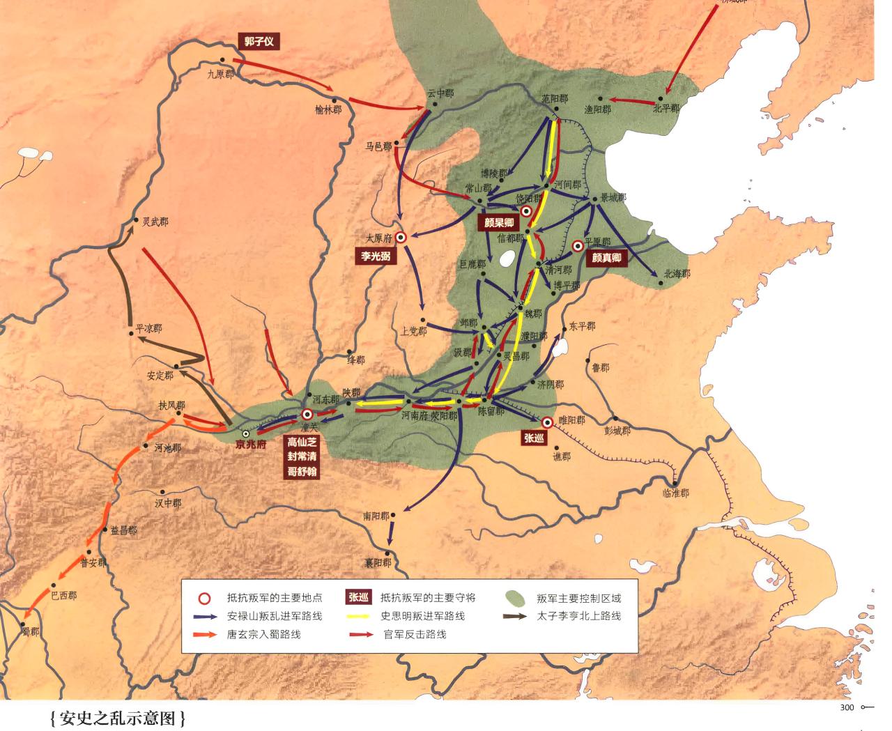 开元、天宝年间,唐玄宗根据防御区域的不同,又陆续在沿边设立了范阳、朔方等八个节度使和岭南经略使。并将各地的军府、守捉(比军小一级)等军事单元划入,最终确立了十个固定的节度军镇。