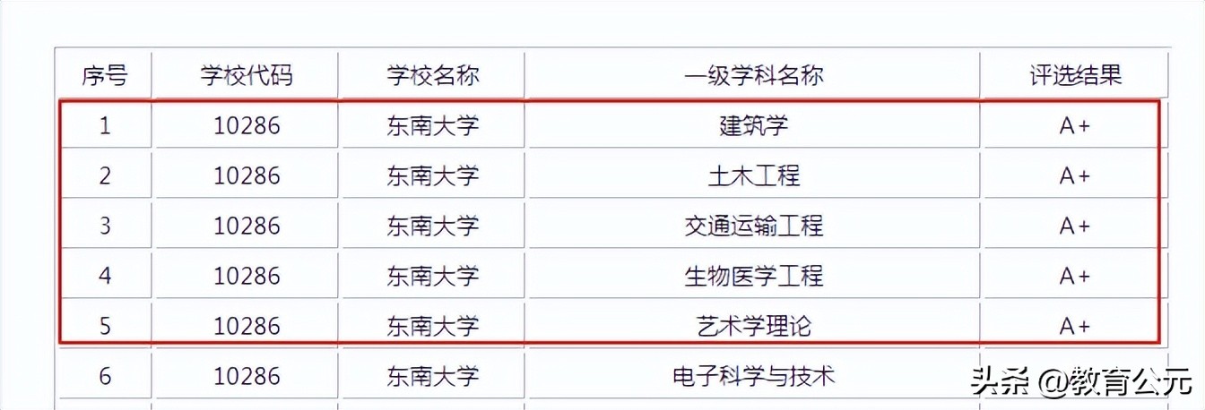 在教育部第四轮学科评估中,东南大学—5个学科获得A+,并且A+学科并列全国第8,甚至超过同城“双子星”的南京大学,位列江苏省高校第一。