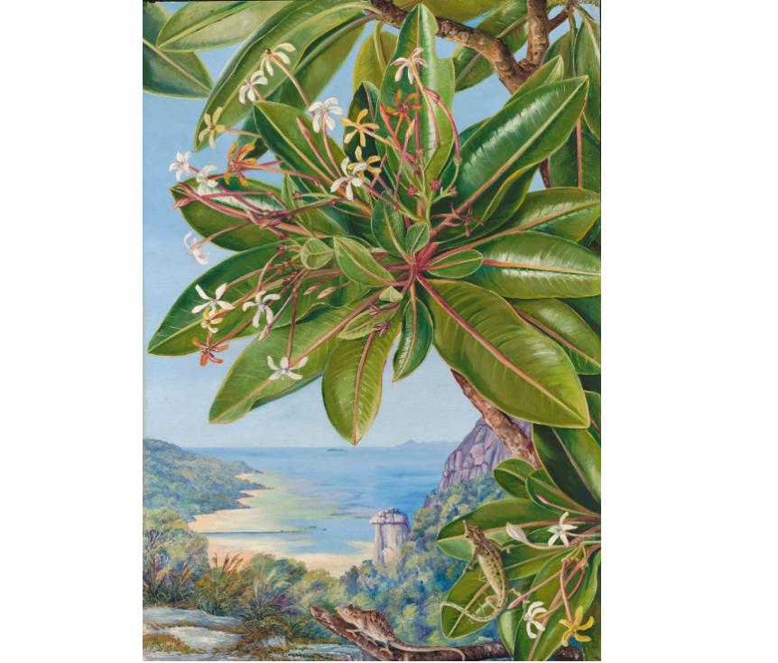 可能因为诺斯最关注的就是景观里的植被和生物,所以她会非常仔细地观察,然后很有耐心地一点点描绘出所有细节。在诺斯的画作中,我们可以看到植被里的每一棵树,可以看到树上的各种附生植物和藤本植物,甚至可以看到藏在植物里的鸟类和哺乳动物,虽然这些动物有时候只是画面里一个不起眼的小点。