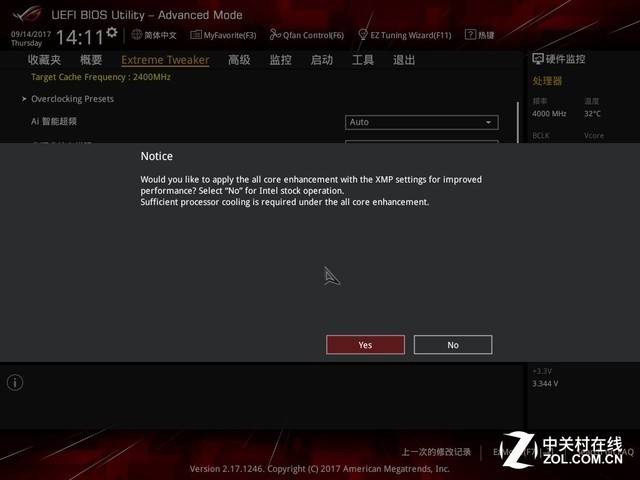 在Ai智能超频选项中选择XMP,一般能超频的内存都会有这个模板,选择它会自动将内存调整到最高超频频率。