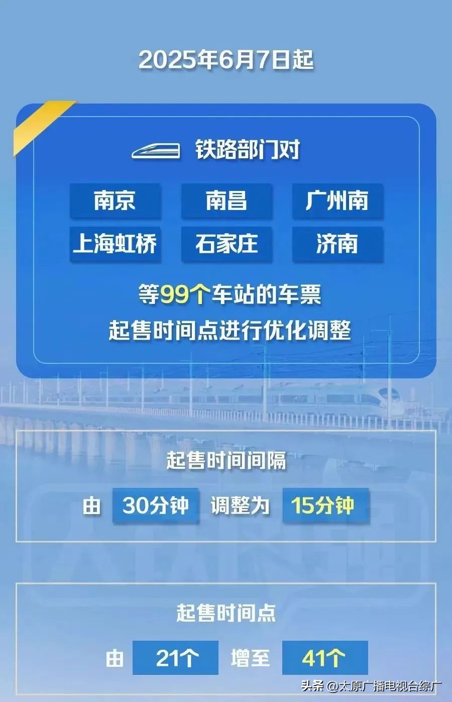 7日零时起,铁路部门对99个车站的车票起售时间点进行优化调整起售时间间隔由30分钟调整为15分钟起售时间点由21个增至41个其中,太原南站出现调整