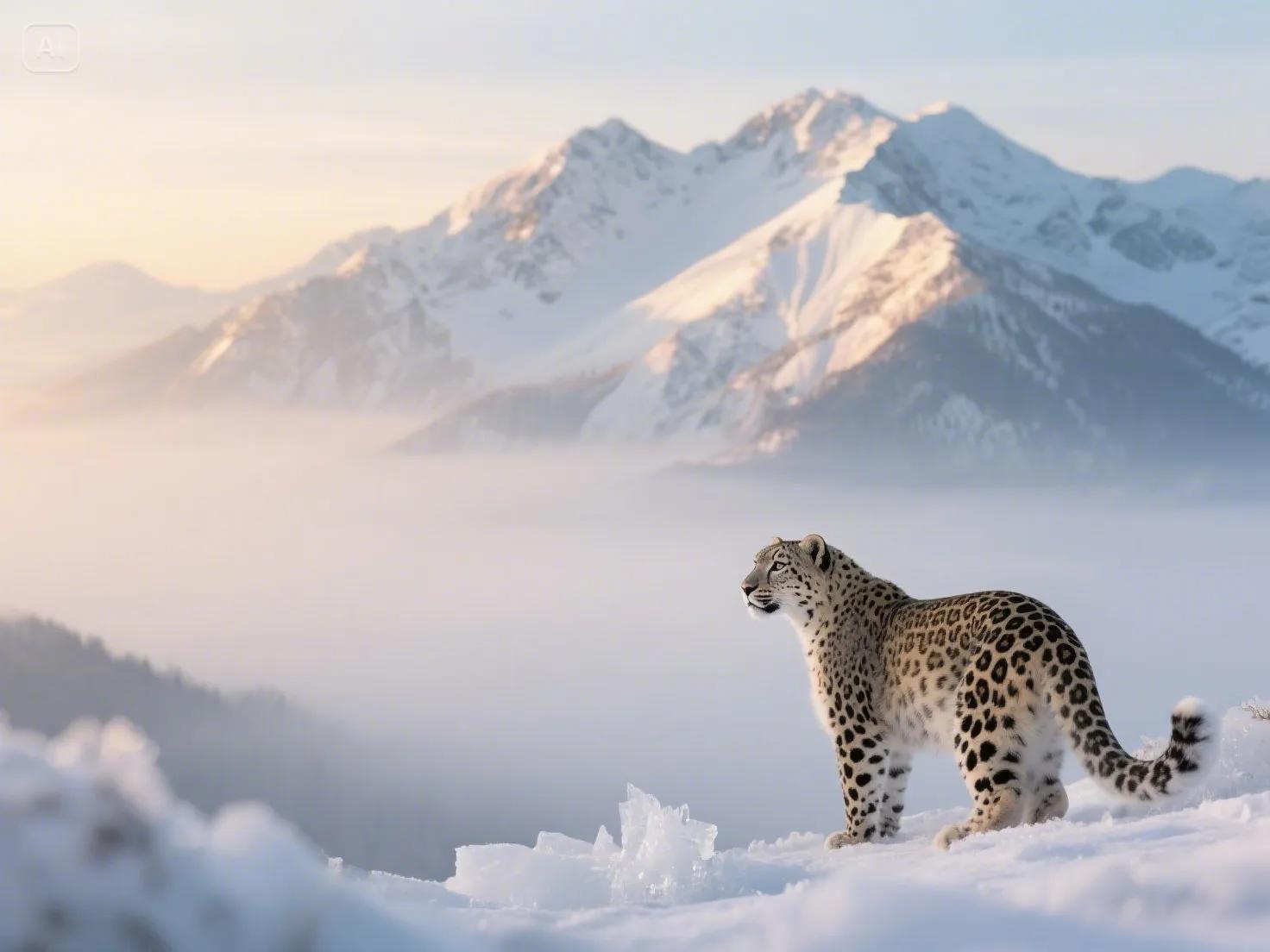 “雪豹驻足于左下三分点凝视远方,晨光微曦映照雪山棱线,浅景深虚化远景山脉轮廓,薄雾笼罩山巅营造空灵氛围,3:2宽幅构图强化空间纵深感,景深0.8模拟真实光学虚化,8K超清画质呈现豹纹与冰晶质感”