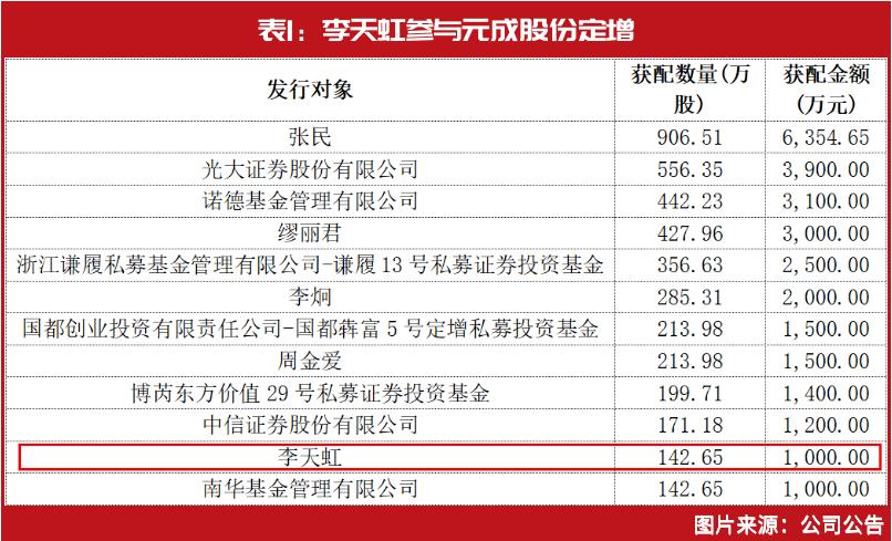 据元成股份11月5日发布公告称,定增募资已经完成,资料显示,该次定增以7.01元/股为增发价格,共发行4059.15万股股份,合计募资为2.85亿元。发行对象共12名,其中,共有5名自然人,李天虹认购142.65万股,以自有资金认购1000万元,在12名发行对象中排名第11(见表1)。