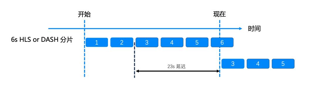 海外的 CDN 基本都只支持切片式的协议如 HLS/Dash 等,不支持 FLV 这类“过时”的传输协议。但 HLS/Dash 因为切片的存在,而且为了保证视频的压缩率,切片一般都是秒级的,且需要切片完全生成才能分发该分片,并且需要至少两三个分片都生成完才能分发,所以和流式的协议相比,延迟上天然有一些劣势。其实这也是竞品使用的方式,如下图,每个分片 6s,在三个分片生成完后才可以分发,带来了 23s 的延迟。世界杯期间,在视频同源的情况下,其它产品的延迟显著高于 抖音 ,就是因为使用了类似的 HLS 的切片传输方案。
