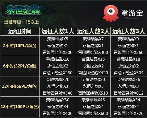 除了完成指定冒险团成就之外,进行冒险团远征也是获取冒险团经验的重要方式。以角色等级为梯度,一共分为四个冒险区域。远征的时间越长,消耗的PL越多。同样远征的人数越多,增加的奖励越多。除去远征地域特殊礼盒外,2人远征的奖励是1人的1.5倍,3人远征的奖励是1人的1.8倍。●永恒之森远征等级需求:15级永恒之物:开启可从格兰之森卡包X1、稀有灵魂X1、炉岩炭X1中随机获取1件