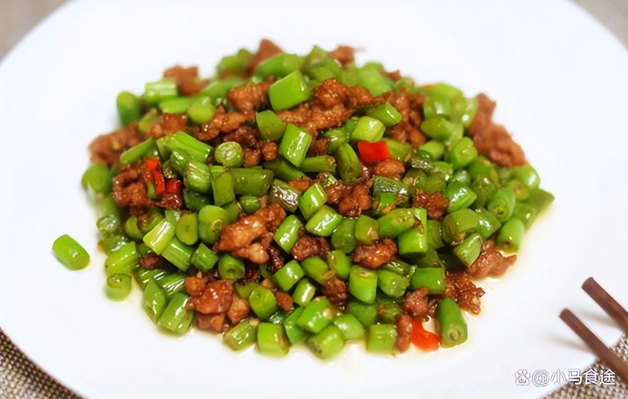 1.豆角摘洗干净掰成段或者切成段,下入六七成热的油锅中炸至断生,捞出控油备用。芽菜泡水洗一下,捞出剁碎备用。