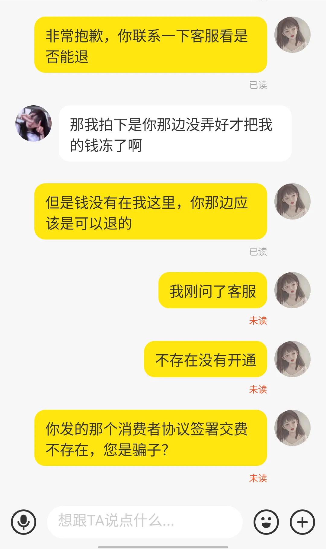 天呐,第一次卖闲置,晚上有人下单,付了款我这边看不到订单,他发给我一个视频,说是这边没有开通消费者保障协议,需要支付宝扫码开通,好家伙,我扫完要我交5000开通消费者保障协议,吓我一大跳,然后我就警惕起来,毕竟要命一条,要钱没有,我就让他自己退,他又说因为下单冻结大笔资金,想讹诈我吧,然后我一时的不知道怎么办,吓得小心脏砰砰的跳,然后就去知乎找答案,才发现好多人跟我一样,骗子捣乱(怒`Д´怒),麻了麻了,我支付宝还扫了他的码,害怕,会不会有问题