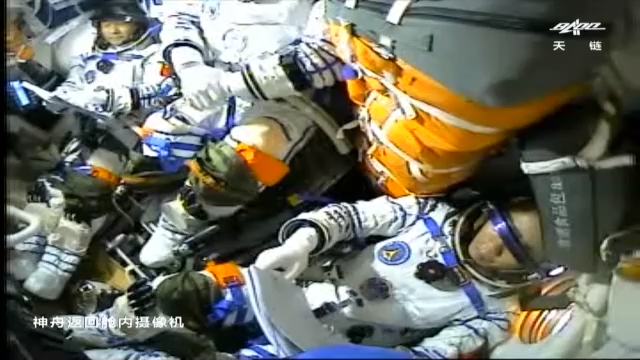 北京航天飞行控制中心神舟十二号任务副总师 胡国林:到了返回当天早上,(航天员)择机会再换上压力服。换完以后就会不再换回工作服了,进行返回前的一些设置。设置到位,进行束缚,整个的返回流程。