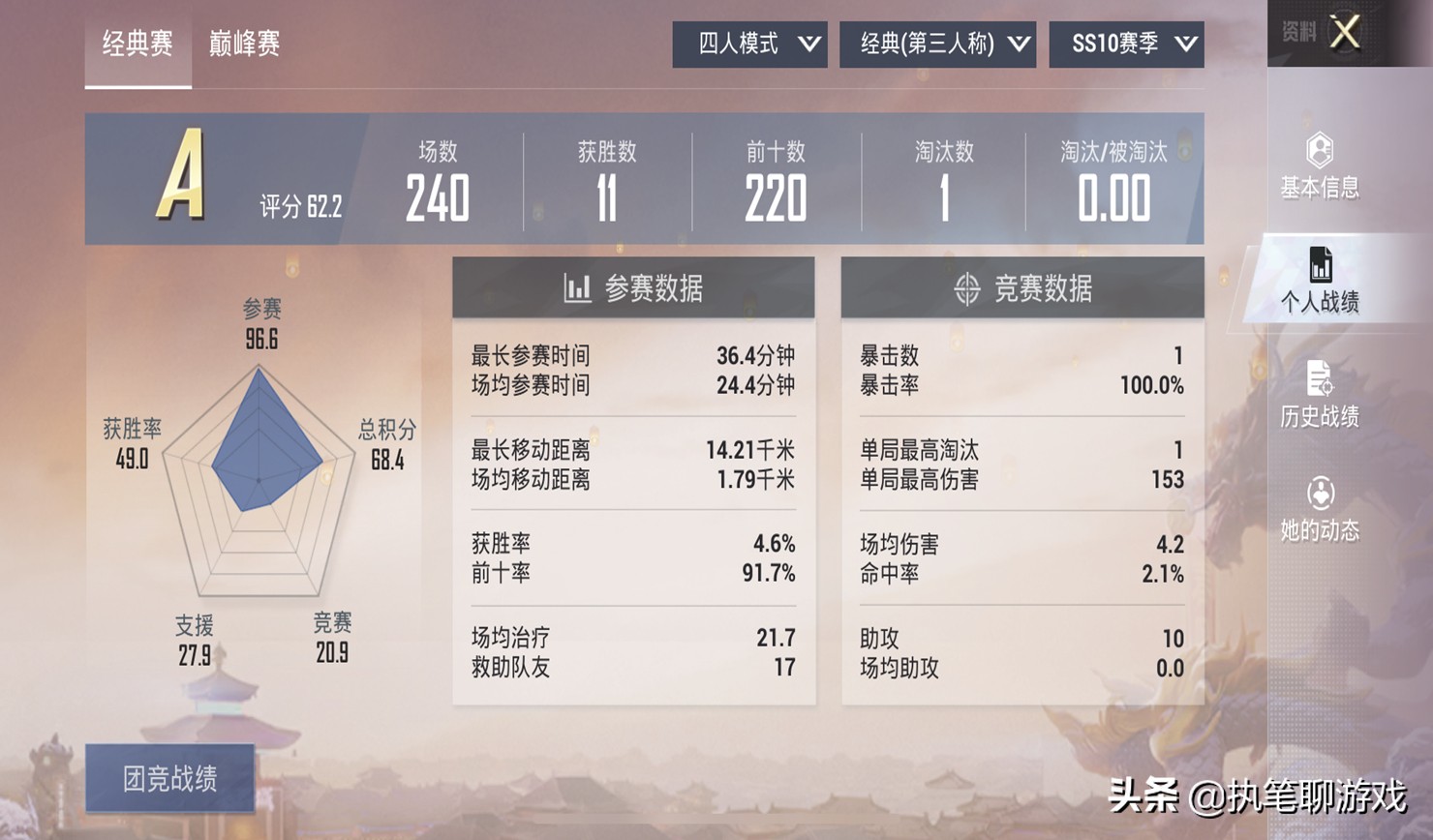 值得一提的是,细心的天哥特意看了一下他此前赛季的战绩,才发现这位玩家确实超乎想象,他从SS10赛季至今,每个赛季的KD都是0,淘汰数要么是1,要么是0~换而言之,他的这种游戏玩法,已经坚持了至少8个赛季之久了。