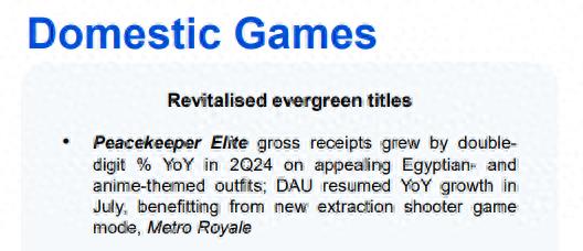 但同在这个阶段,行业里也有“强者从不抱怨环境”式的故事——腾讯Q2财报及电话会议信息显示,得益于全新玩法“地铁逃生”,以及“沙丘之主-图卡盟”等神装的多重助益,《和平精英》第二季度收入实现两位数同比增长,产品DAU也在7月进一步拉升。