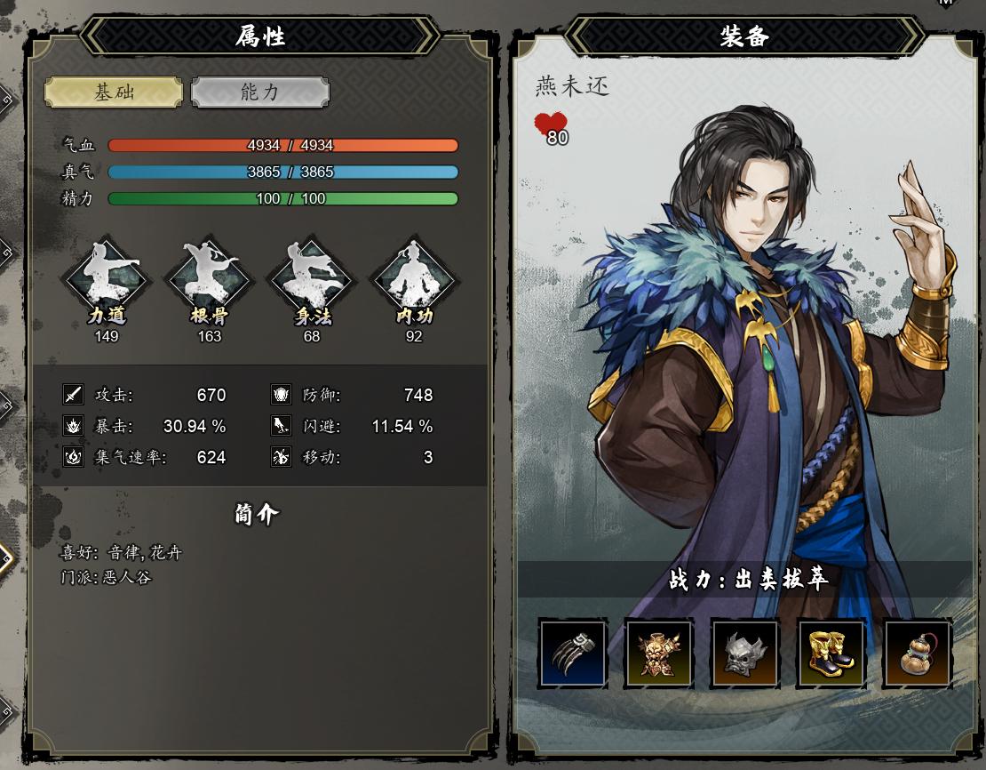 燕未还无论从剧情里的人物塑造,还是颜值和强度来说都是十分值得培养的队友。虽然说入队的时候主线剧情也来到了主线的后期,然而其极高的初始属性和自带的神龙掌法系列都值得玩家们后期把资源砸在他的身上,可以说是极其强大的输出角色了。