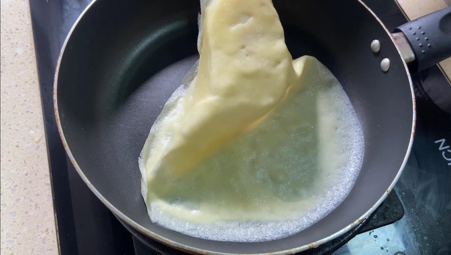 4.不粘锅洗净,用厨房纸擦干水分,开小火。锅底烧至温温的程度,勺一勺面糊,倒在锅里,手腕转动锅柄,让面糊薄薄的铺平在锅里即可。如果面糊太粘稠会流动慢就会很难铺平整,这时就要加入适量的清水调解一下。