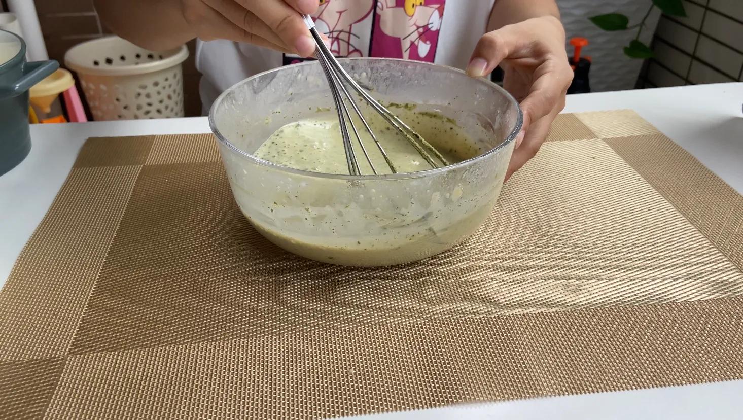 取一半面糊加入10克抹茶粉,搅拌均匀,也过筛两遍,面糊无颗粒,混为一体。