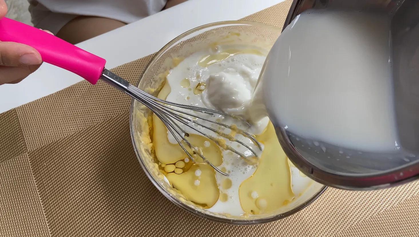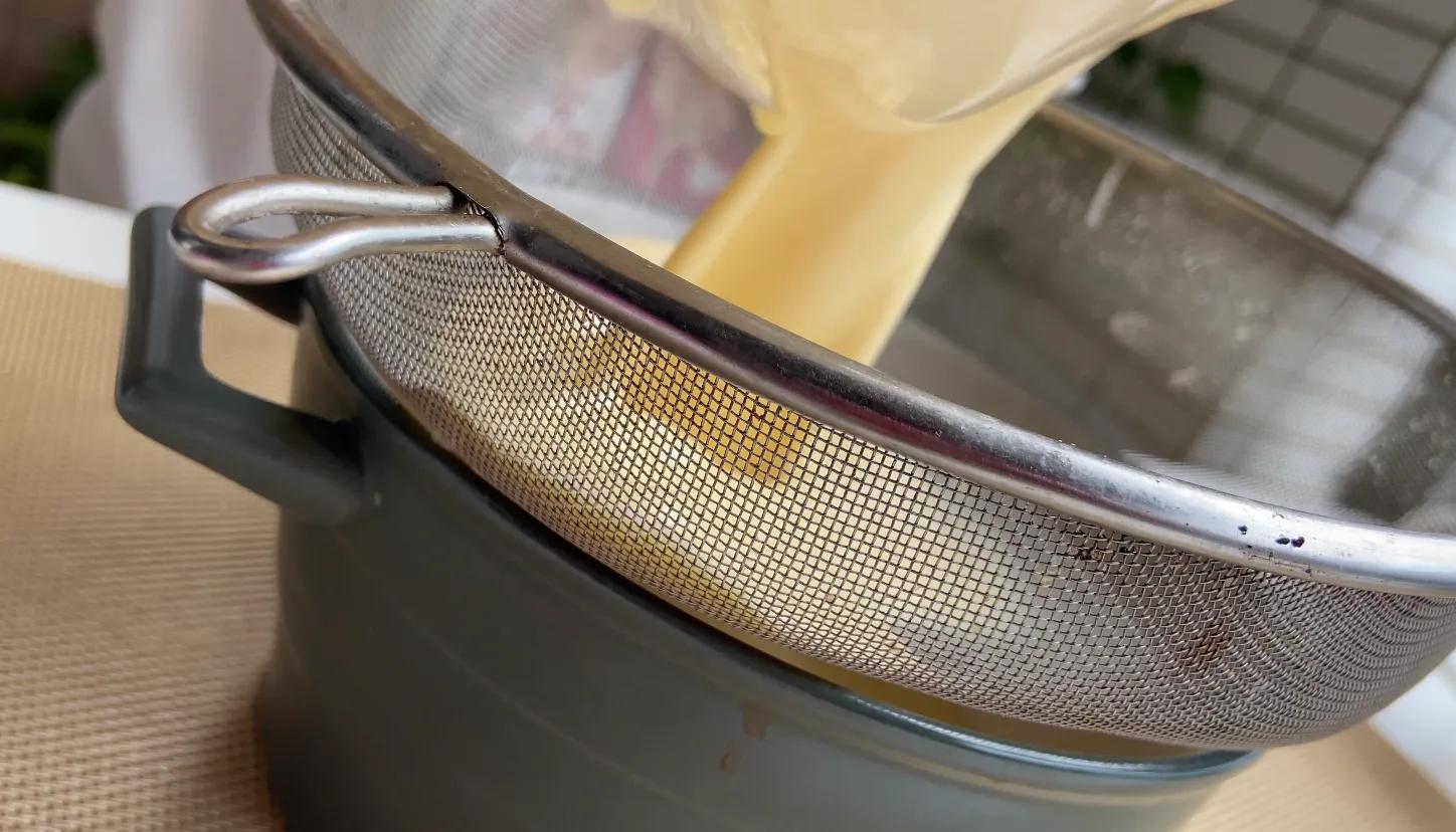 3.加入40克玉米油和430克纯牛奶。把所有材料搅拌混合均匀,融为一体。然后过滤两遍,最后是无颗粒顺滑的面糊。