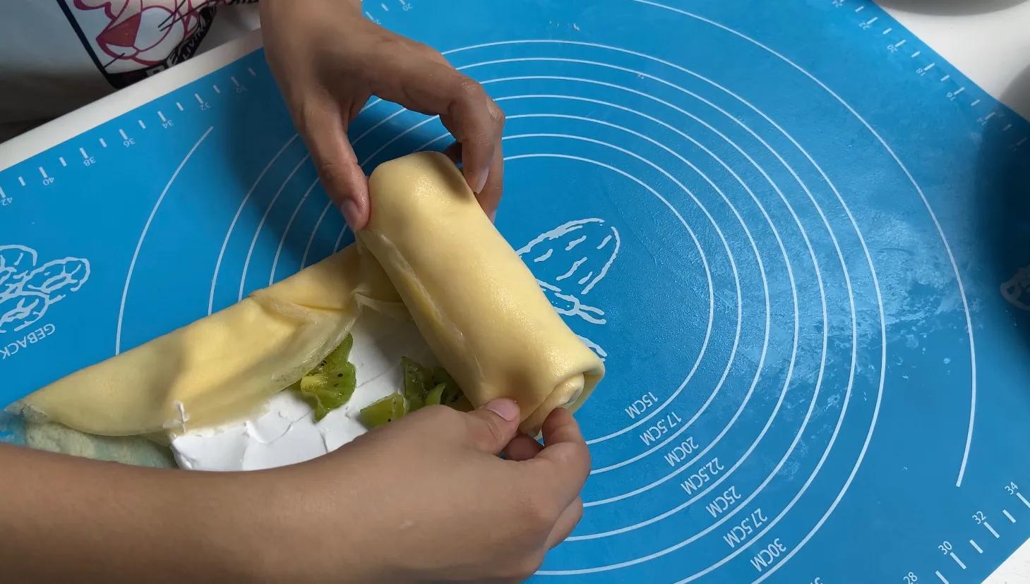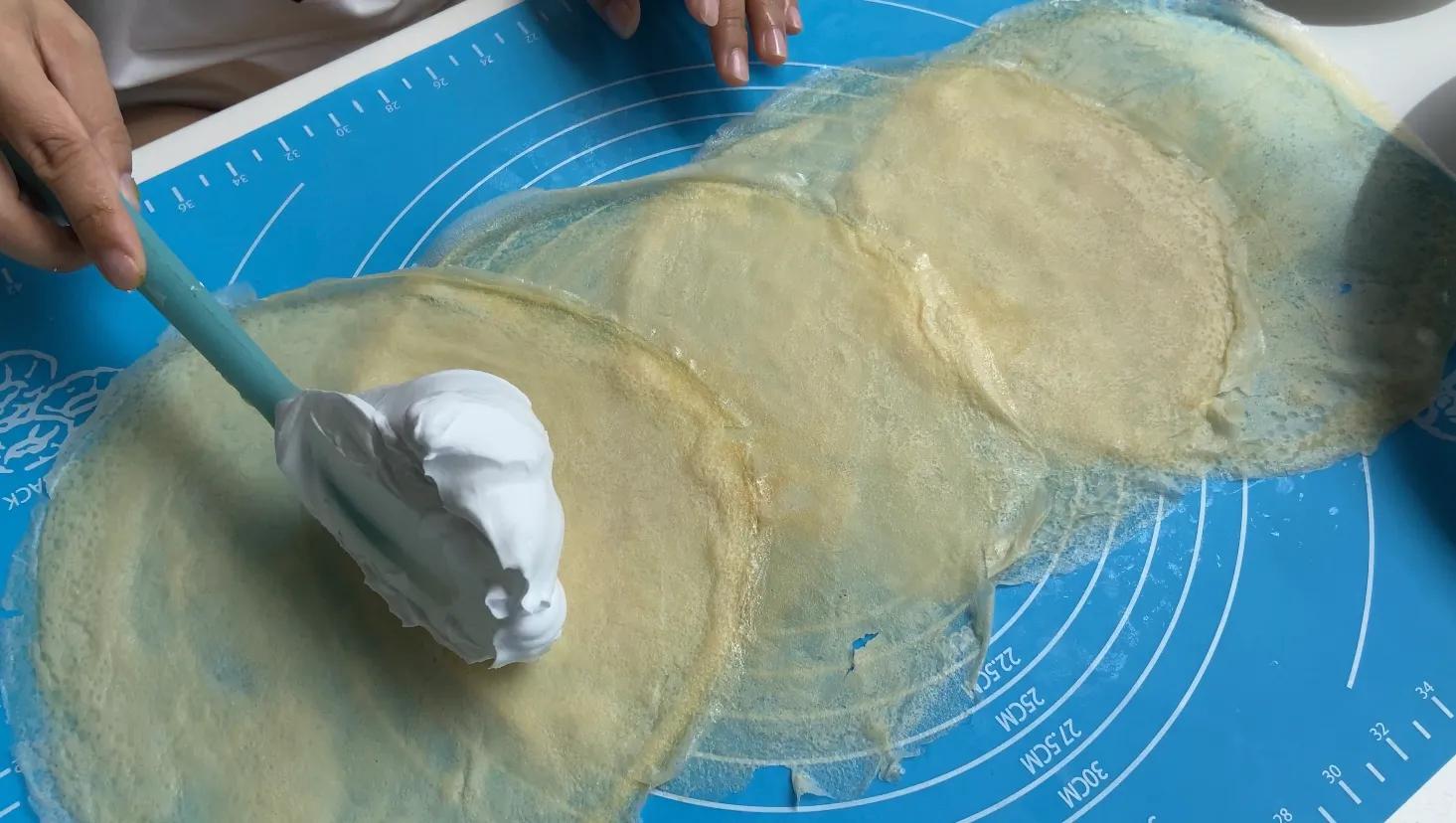 7.把4张皮相交错叠铺好,放上打发好的奶油。喜欢加水果的,可以把水果切碎放在奶油上就可以了。然后把两边向里面叠,从一头卷起来,用保鲜膜卷起来放冰箱冷藏室冷藏1个小时口感更佳。