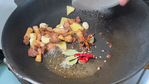 11. 炒匀后下入八角,花椒,香叶,干红辣椒翻炒,加入老抽