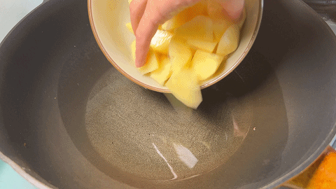 7. 起锅加入植物油,比平时炒菜的油稍微多一点,下入土豆块煎制