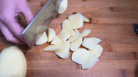 4. 削去外皮的土豆,切成滚刀块,放入大碗中加水清洗
