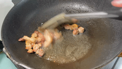 10. 炒出五花肉中的油脂,炒焦之后倒入姜蒜爆香