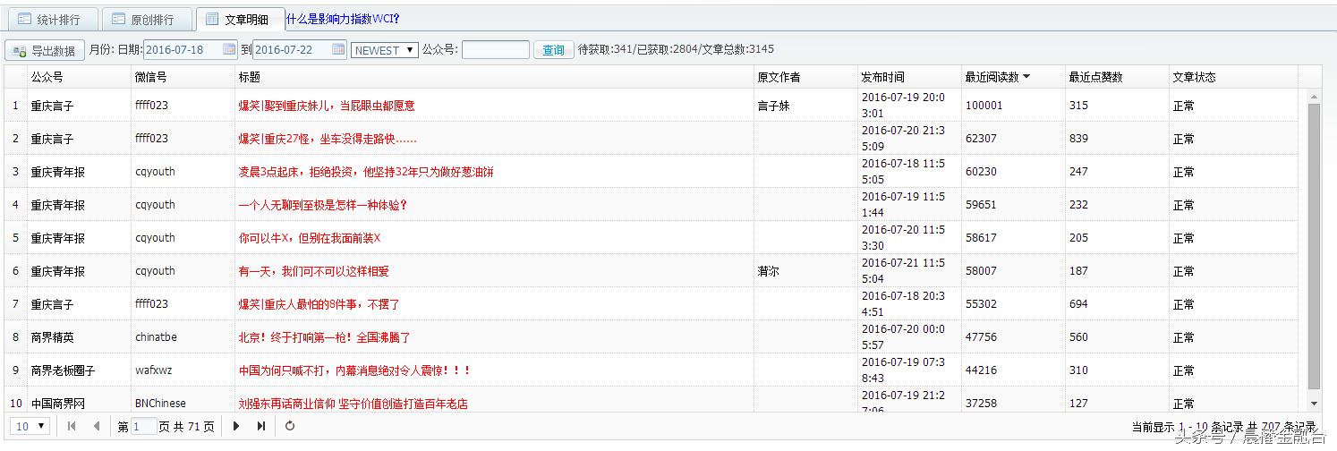 从排行榜来看,重庆青年报位居第一,其次是自媒体平台重庆言子,重庆晨报的综合排行量也不错,排在了第三。