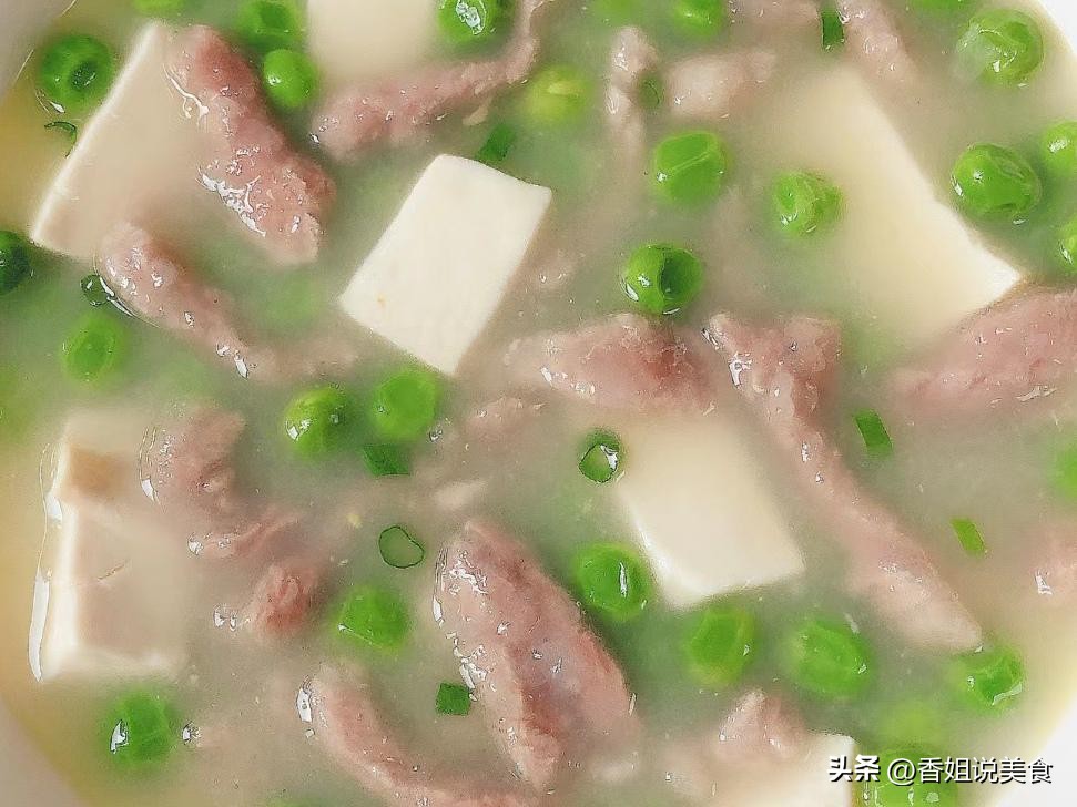3、然后再放入豌豆煮,煮至浮起来后放入嫩豆腐继续煮两分钟。然后再放入腌制好的猪肉,煮两分钟。
