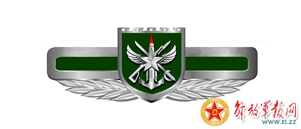 火箭军胸标。设计元素由五星、导弹、象征胜利的“V”字底托、祥云状火焰(意指导弹发射时推进剂燃烧形成的气体)和橄榄枝组成。五星、导弹居中,导弹呈发射状态,“V”字底托向上、向外延伸形成祥云状火焰,火焰底色为深红色。寓意火箭军是维护国家主权和领土安全的“威慑核心、战略支撑、安全基石”。设计风格与陆军、海军、空军胸标既协调一致,又各有特色,表征作用明显。