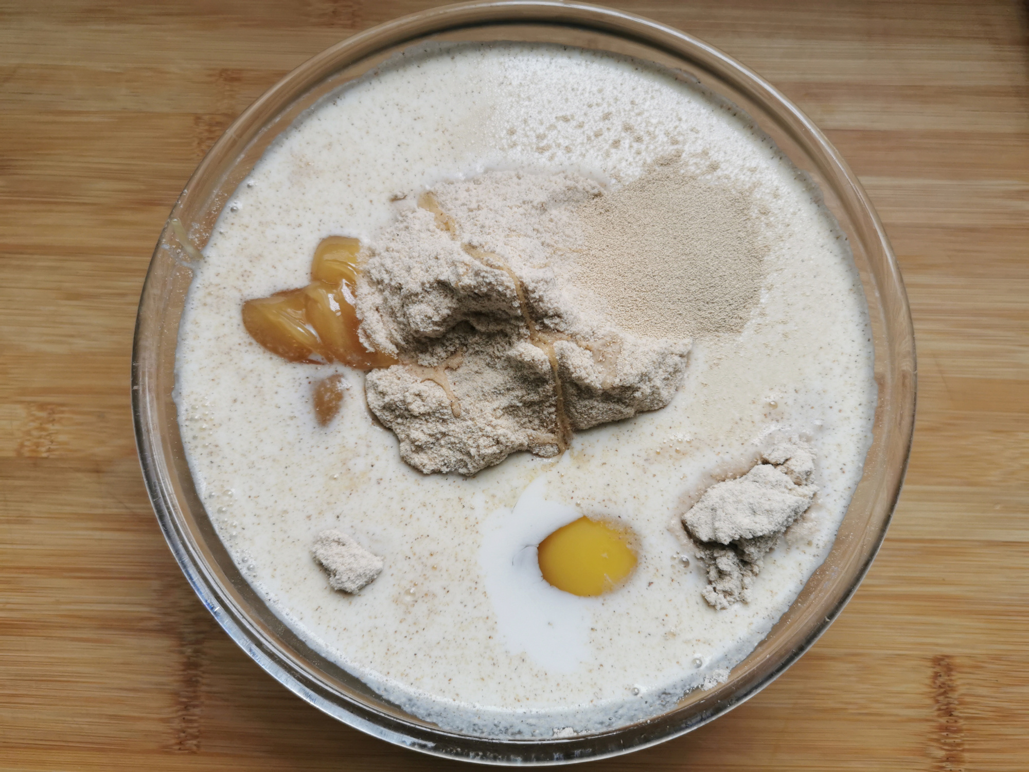 1、碗中倒入黑全麦面粉、酵母粉,倒入牛奶,加入一个鸡蛋,搅拌成面絮状,再揉成面团。