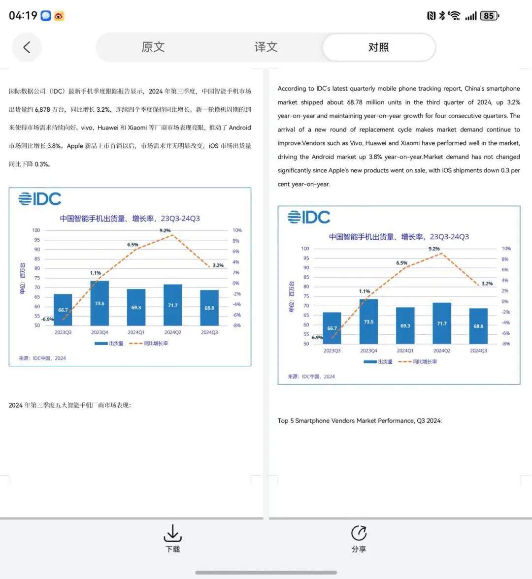 我这样的文字工作者,很能体会华为Mate X6这种“大屏AI”的实用性。比如我收到的英文文档,直接就可以丢给了小艺翻译成中文。借助Mate X6的分屏功能,还能够直接进行中英文的对照查看。一份市场报告,可以让小艺生成一张思维导图。甚至你还可以让它筛选部分数据,生成一份新的图表,非常强大。
