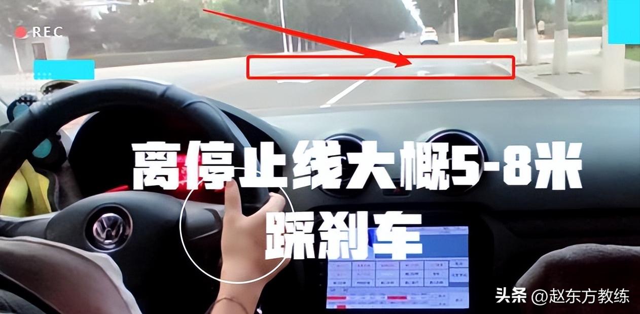 车行驶到路口时,电脑会提前有语音播报,听语音开启对应的转向灯,打开转向灯以后找你要踩刹车的地方,一般都是停止线前30米内,你在练车的时候教练会给你地方。例如我一般带学员的时候告诉在停止线前大概5米至8米一个车位的地方,踩刹车如下图。