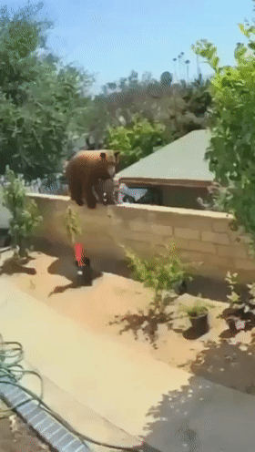 美国加州,一个成年大棕熊带着两只幼崽,闯入了人类住宅区,棕熊还爬上了围墙,向院子里张望...