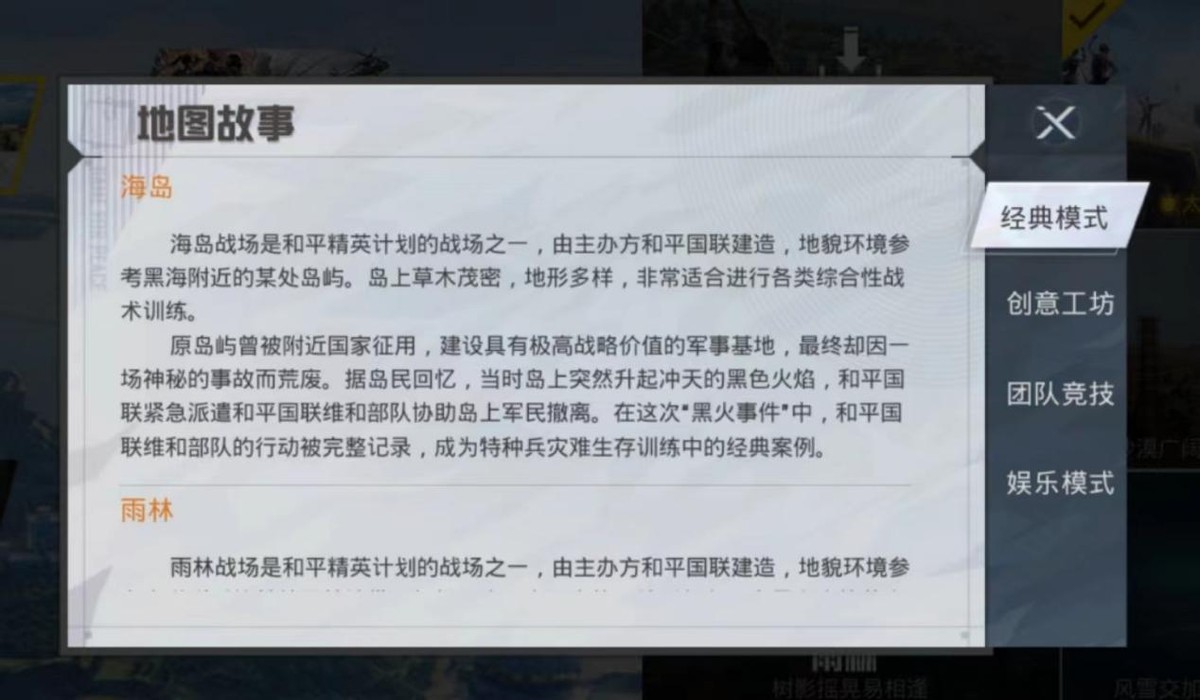 和平精英中创意工坊的所有玩法都是建立在海岛地图的基础上进行设计,而娱乐模式中的大部分玩法也是采用的海岛地图。海岛地图每局都是100人落地开战,大热的物资点分别为G港、P城、军事基地。