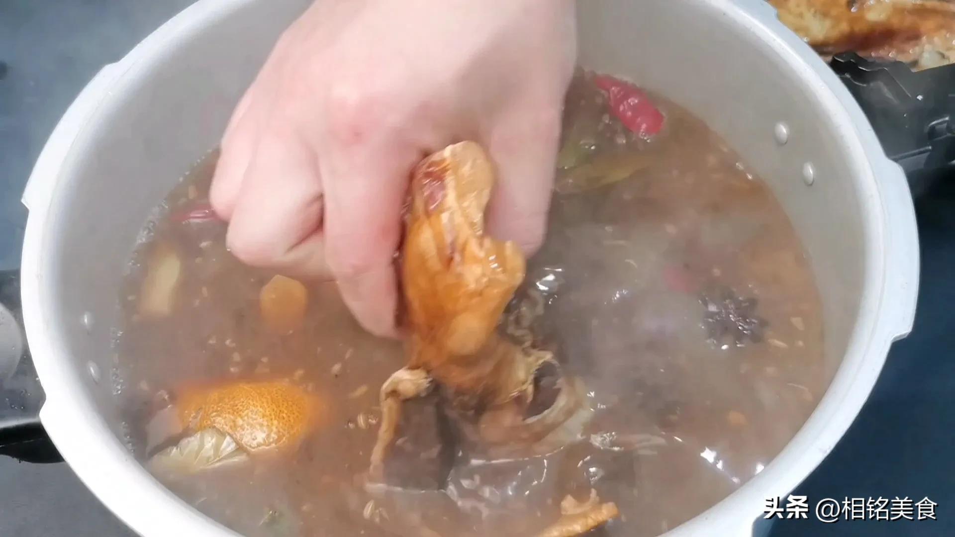 加入十克盐,几粒冰糖,准备一口有深度的锅垫上垫子,防止粘锅,把汤倒进去;