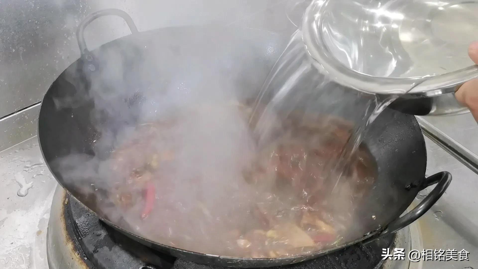 熬出香味以后,加入三斤的水,把陈皮和山楂下锅,山楂可以软化肉质,减少炖煮时间;