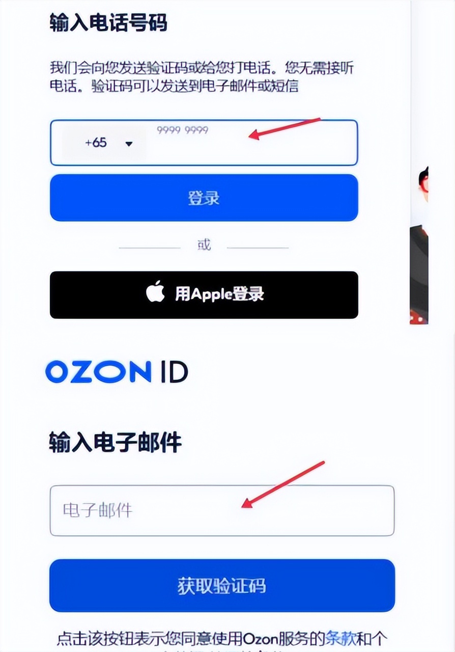 (1)进入ozon网页后可在左下角切换语言为中文,点击注册进入注册页面,输入手机号,手机号用国内的即可,点击登入,就会跳转到输入电子邮件页面,输入电子邮件,获取验证码,填写邮箱收到的验证码后,再填一个手机获取的验证码。