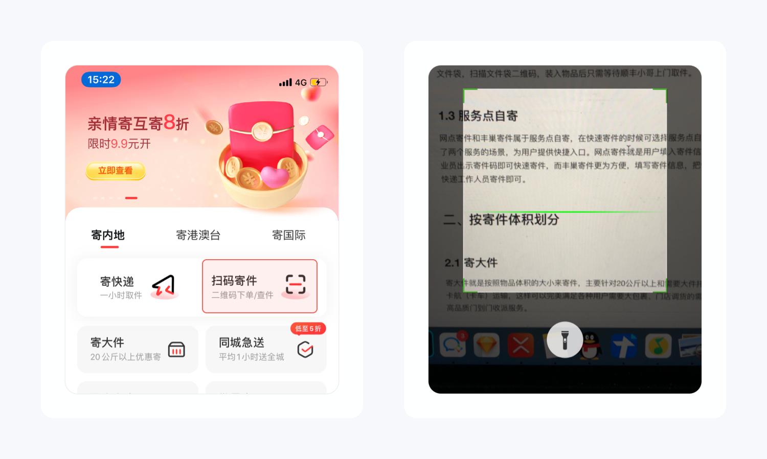 扫码寄件就是二维码下单,核心用户主要是快递数量比较高的用户,通过扫码文件袋二维码,装入物品后快速下单,安全性更高。