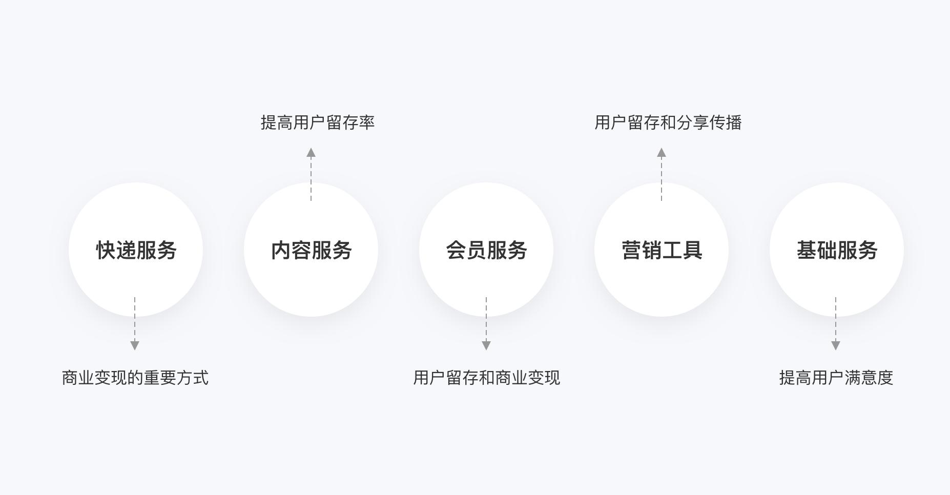 根据增长模型,我们把顺丰的产品功能拆分为快递服务、内容服务、会员服务、营销服务和基础服务五大类。