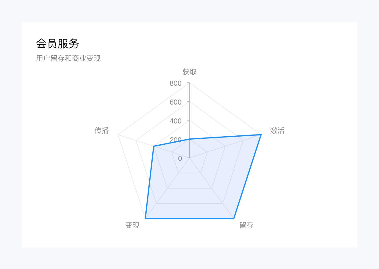 - 会员服务主要帮助产品实现用户留存和商业变现,为用户提供了多达20种会员权益和5种会员卡;