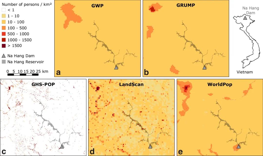 例如,在越南北部,一个大坝修建过程中记录的搬迁居民数为4000人,而研究所参考的5个数据集均严重低估了这一区域的人口数量,有数据集只记录了不到1000人,甚至有数据集在这个区域的人口数据记录接近于0。