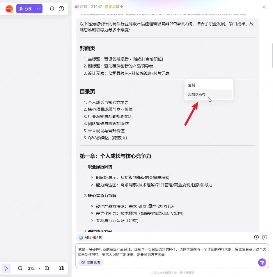 右击DeepSeek生成的PPT大纲,选择“添加到画布”,将PPT大纲插入左侧的AI创作工作空间。